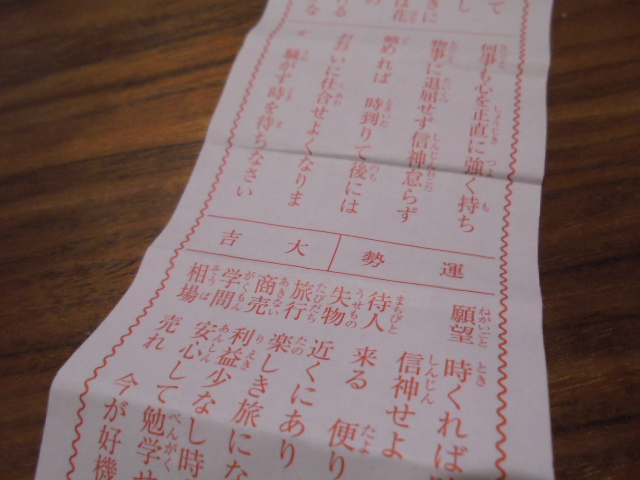 10年に1回くらいの確率。超希少。厄年も終わり、大殺界も終わり、おみくじは大吉。今年はめちゃくちゃ良い年になりますよ?ね、蒼紫様?年末ジャンボ当たりませんでしたけど大丈夫ですよね?ちなみに奥様と息子は「小吉」。ふふふ、君たちは今年は色々とがんばりたまえ。