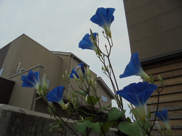 どんより空がバックですが、今年もこのキレイな青のアサガオを育てています。結城(♀)のかなりのお気に入り。私もこの青好きですねー。